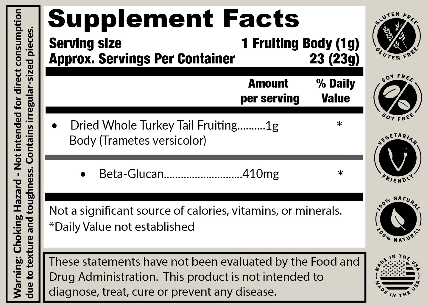 Authenticity Matters. Tremetes Turkey Tail is grown in small batches in the USA, using whole fruiting bodies—not extracts, fillers, or additives. Celebrated for centuries as a natural ally for immunity and gut health, Turkey Tail is valued for its ability to promote balance, resilience, and overall vitality.